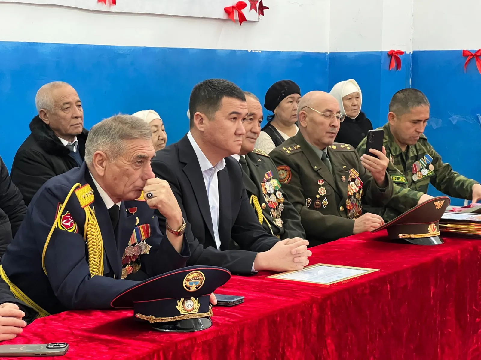 Иш-чарага Манас шаардык кеңешинин төрагасы Нуртилек Болотов, шаардык кеңештин депутаттары, “Мекенди коргоочулар” коомдук бирикмесинин төрагасы Жайлообай Эшанкулов баштаган бирикменин өкүлдөрү, аскерге чейинки даярдык сабагынын мугалимдери, мектеп жамааты, окуучулар катышты.